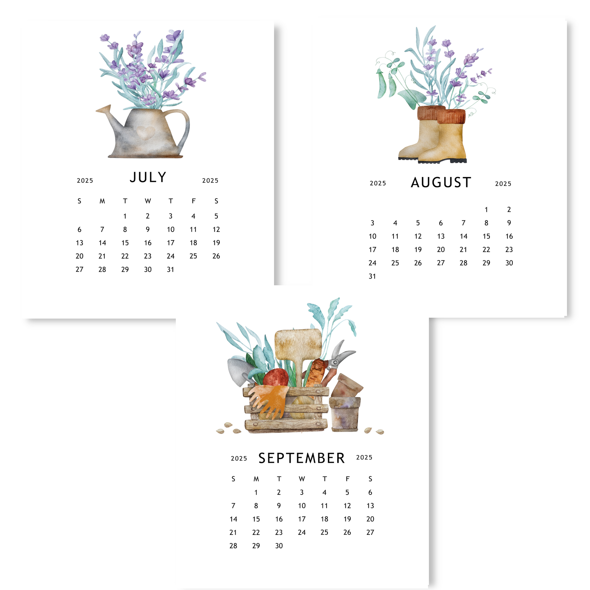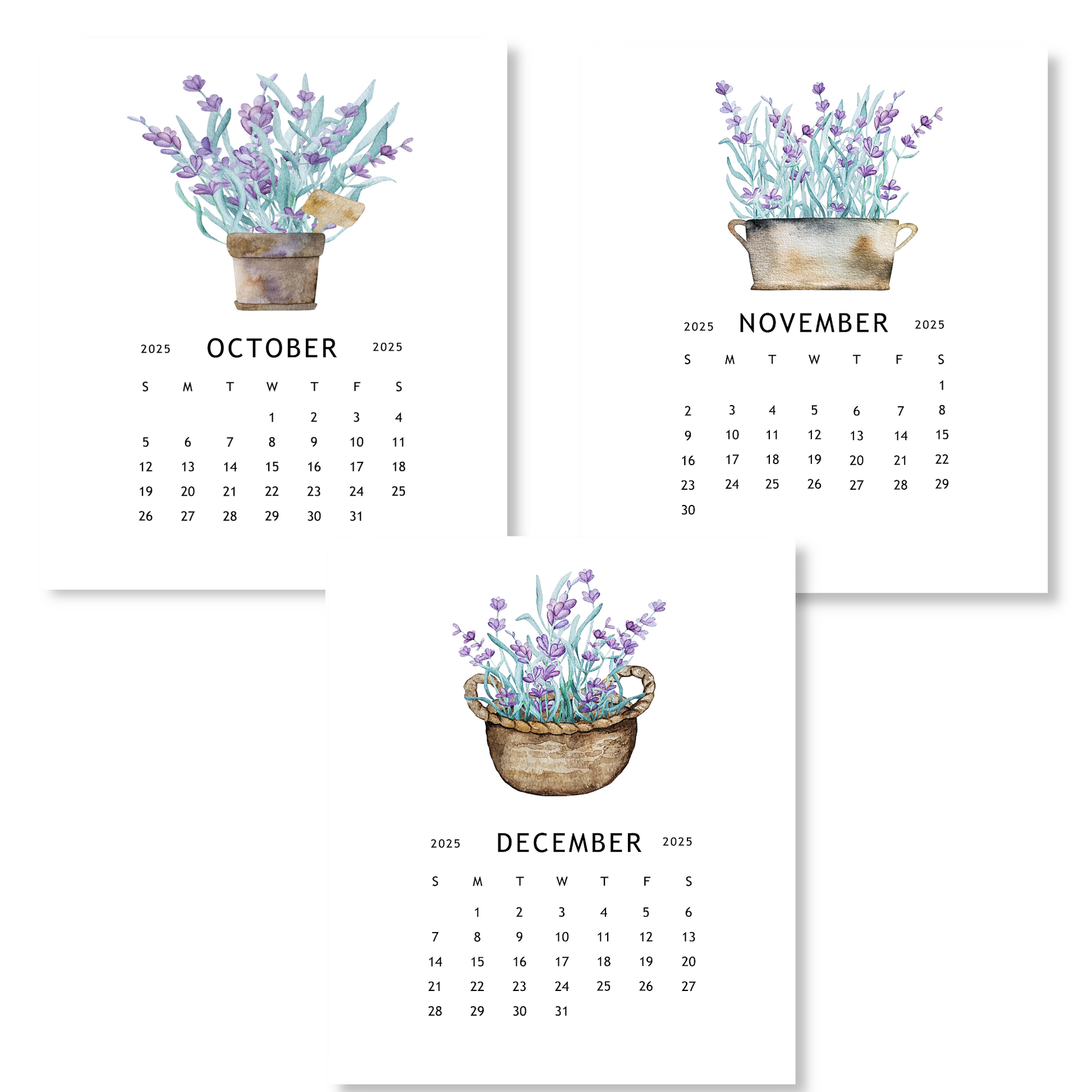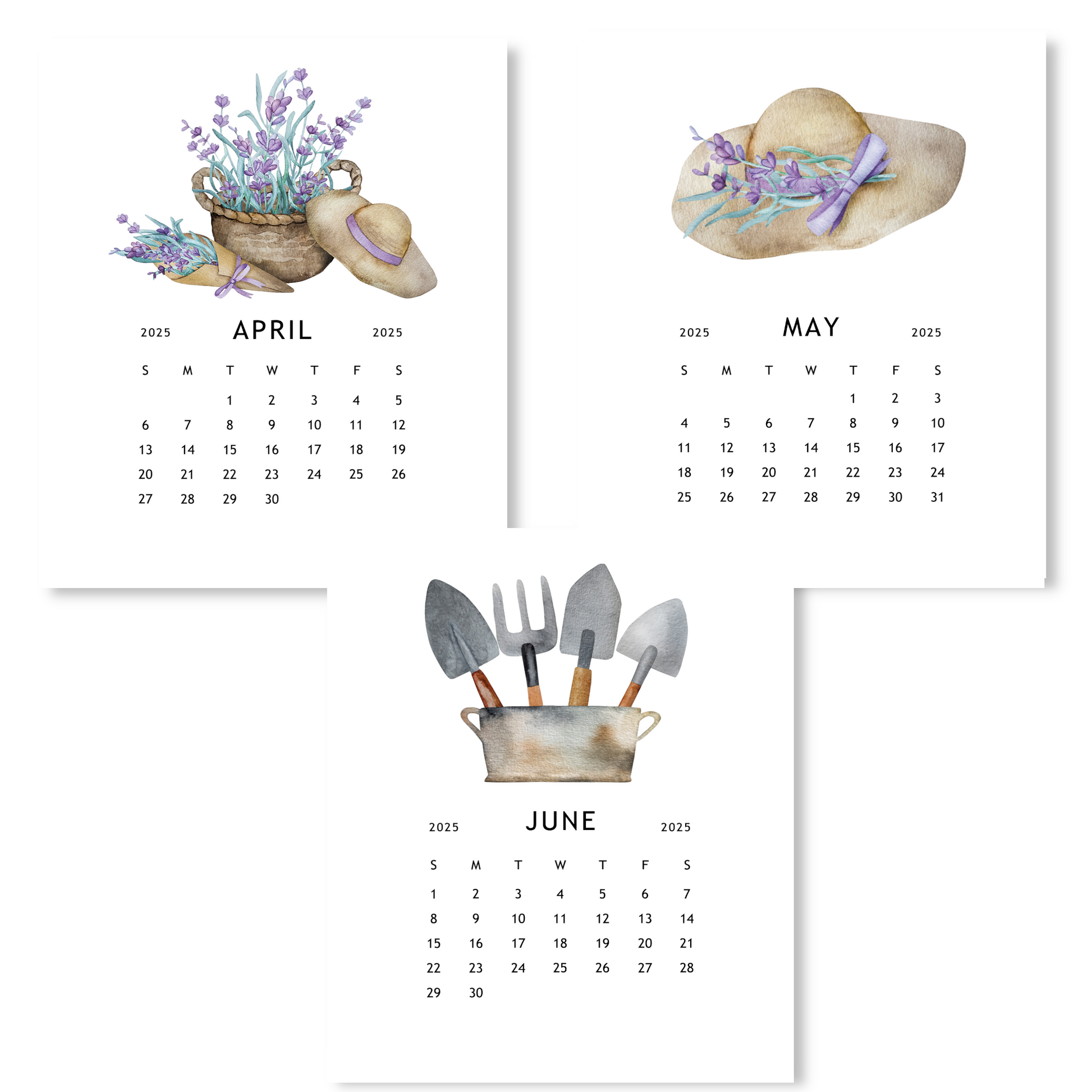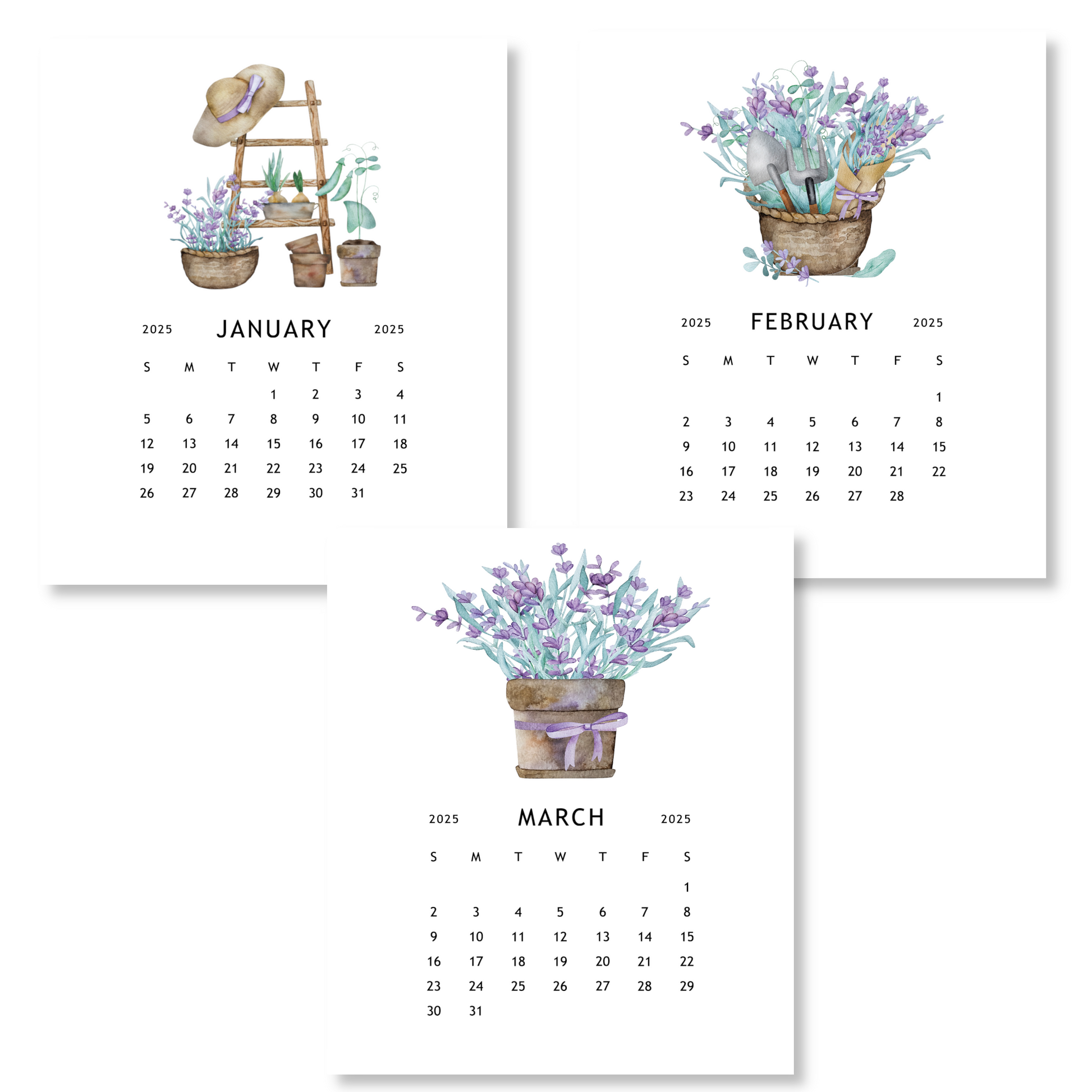Stay organized and inspired with our 2025 Lavender Garden Calendar! Each month features a beautiful watercolor image of potted lavender plants and/or essential gardening tools. The compact desk size design comes with an acrylic stand for display. Plan your year with the calming charm of lavender.