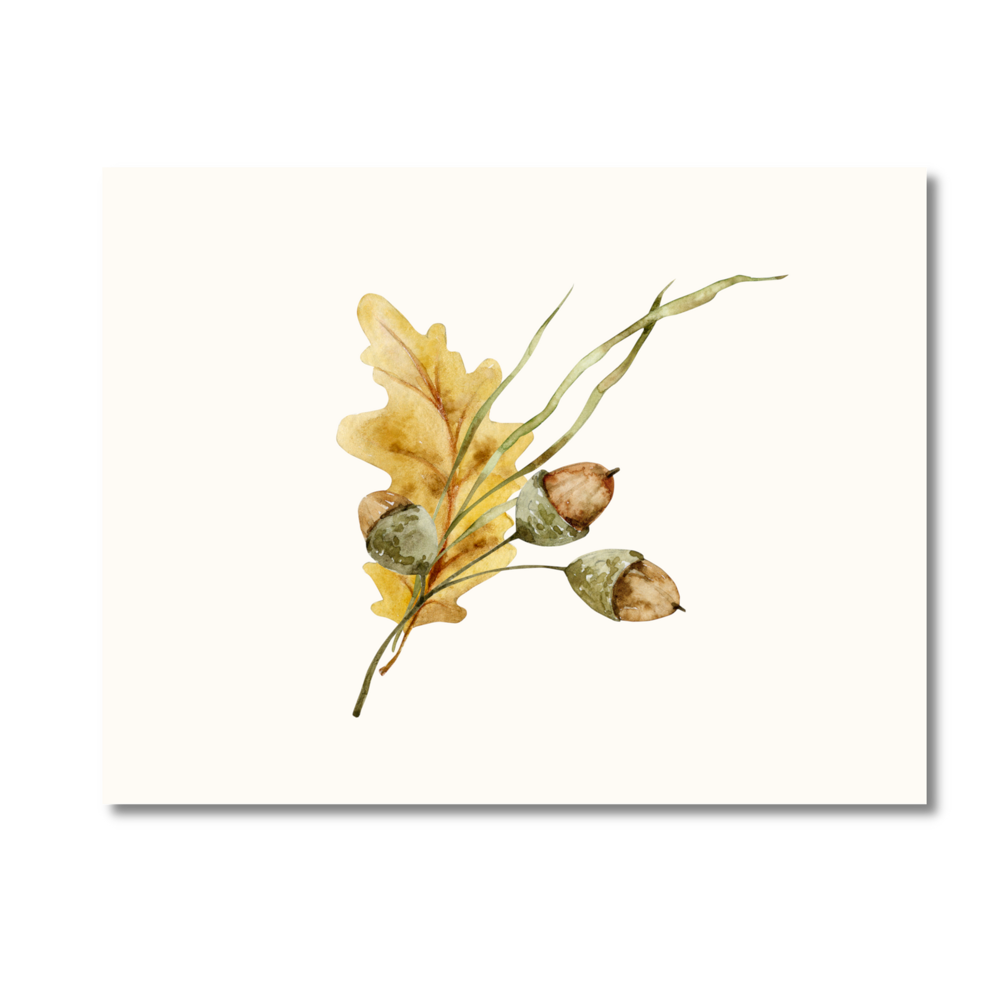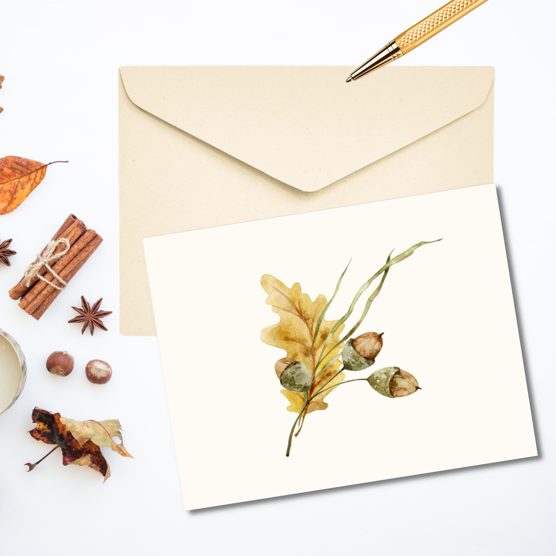Stay connected with nature this season with our Autumn Acorn Note Cards. Each card features a beautiful watercolor acorn with lovely fall leaves on a branch, perfect for sending warm wishes to loved ones. Share the beauty of the season and make someone's day with these unique and charming notecards.