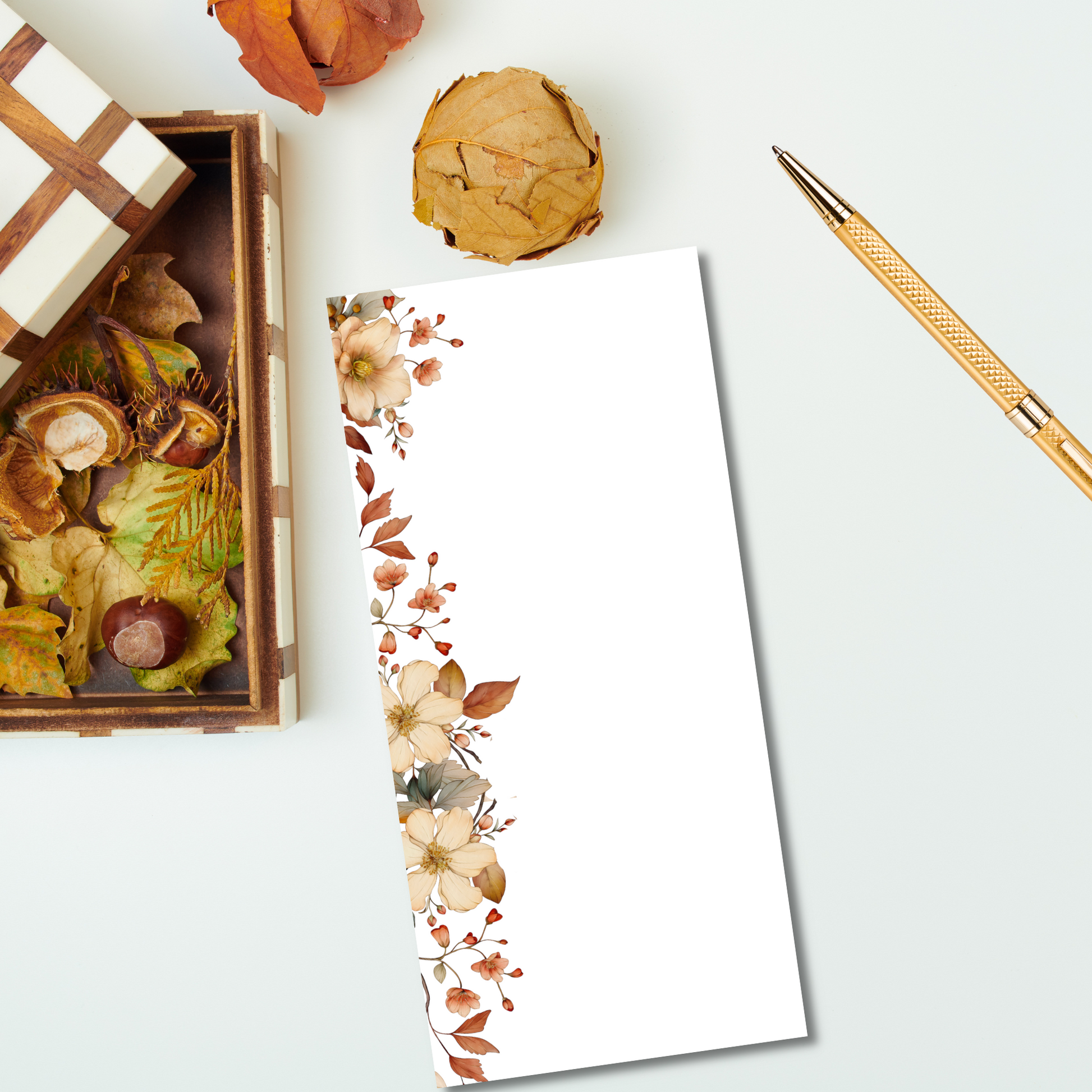 Make writing a breeze with our Autumn Floral Border Long Note Pad! Featuring a beautiful watercolor floral border, this long note pad adds a touch of elegance to your notes. Perfect for jotting down thoughts, reminders, and to-do lists, this notepad is a must-have for any stationery lover. Stay organized and stylish with our Autumn Floral Border Long Note Pad.