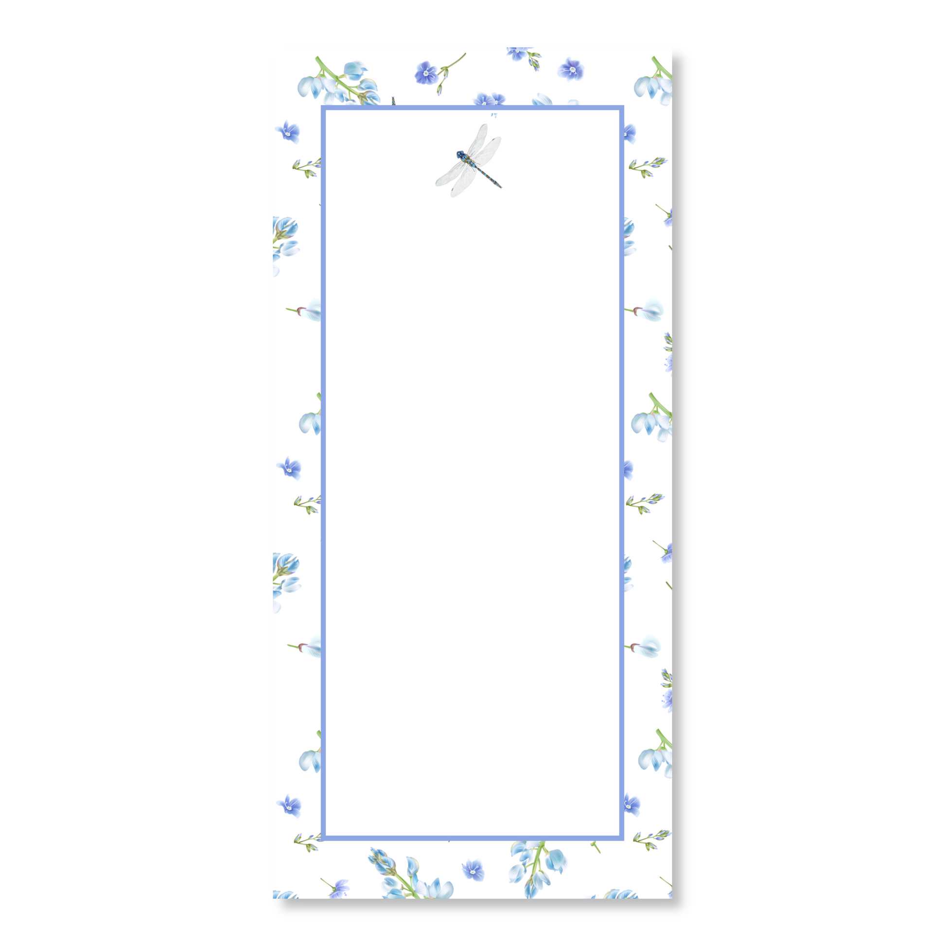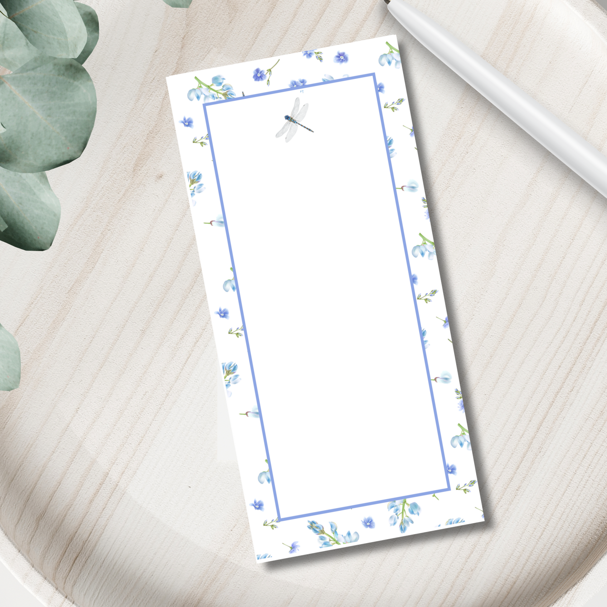 Take your notes in style with our Blue Dragonfly Floral Long Note Pad. This long and thin note pad features beautiful watercolor dragonflies amongst delicate blue flowers. Perfect for jotting down ideas or making lists, it adds a touch of elegance to any desk.