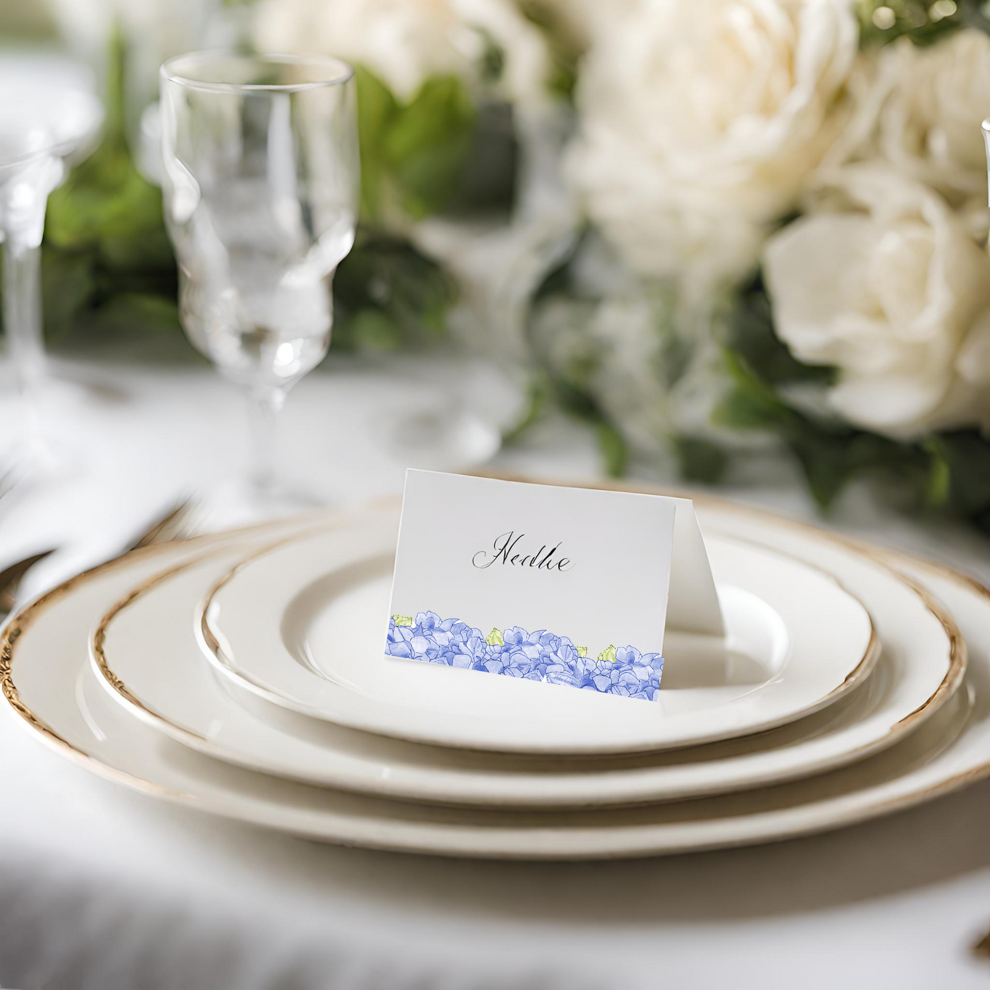 Create a charming and elegant table setting with our Blue Hydrangea Border Place Cards. These watercolor hydrangea borders add a touch of natural beauty to any event. Ensure your guests know where to sit while adding a lovely touch to your décor. Perfect for weddings, parties, and special gatherings.