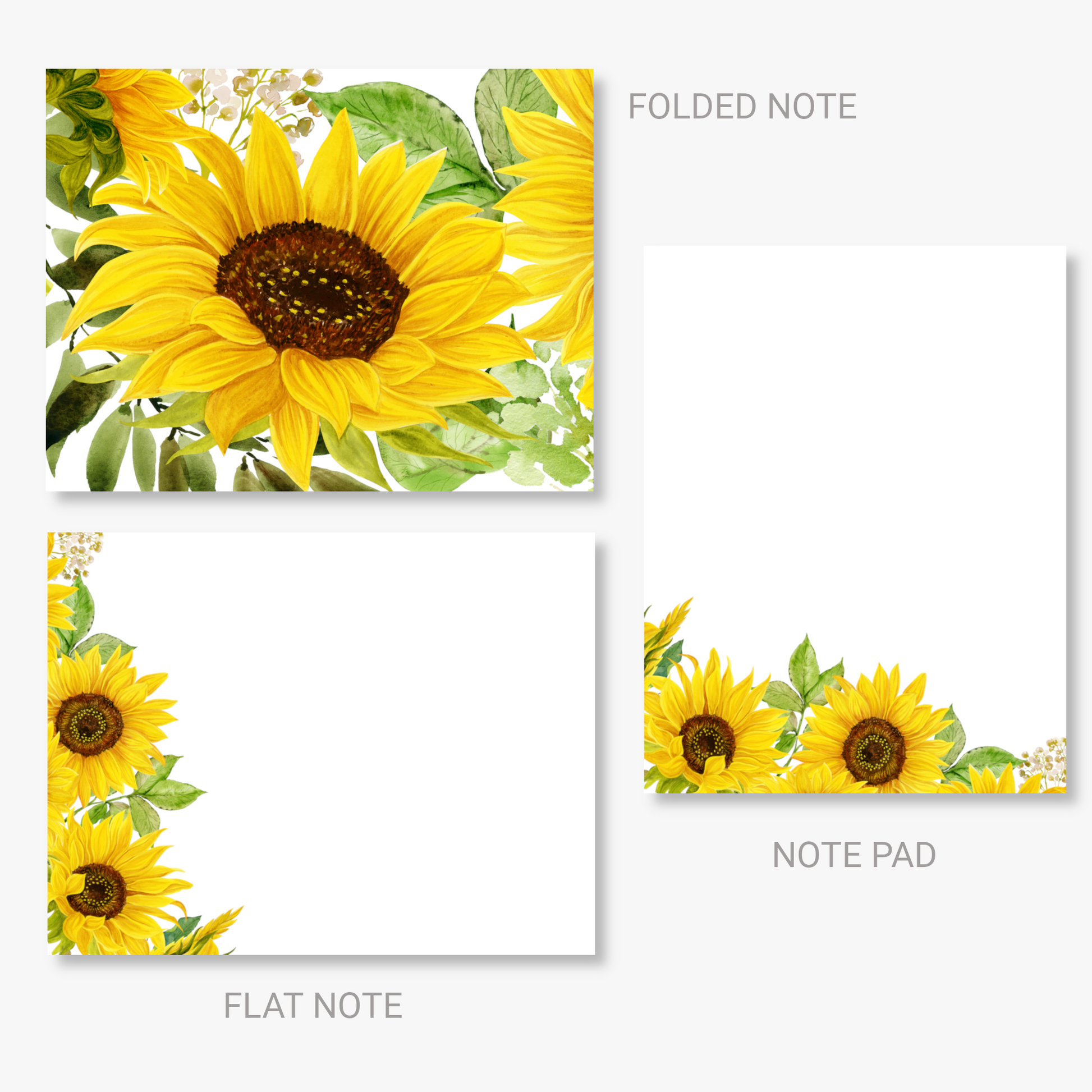 Introducing our Bold Sunflower Stationery Set! This set includes folded notes, flat notes, and a notepad, all adorned with vibrant watercolor florals. Perfect as a personalized gift or purchase as a set and divide into individual gifts for your loved ones. Elevate your gift-giving with our coordinated stationery set.