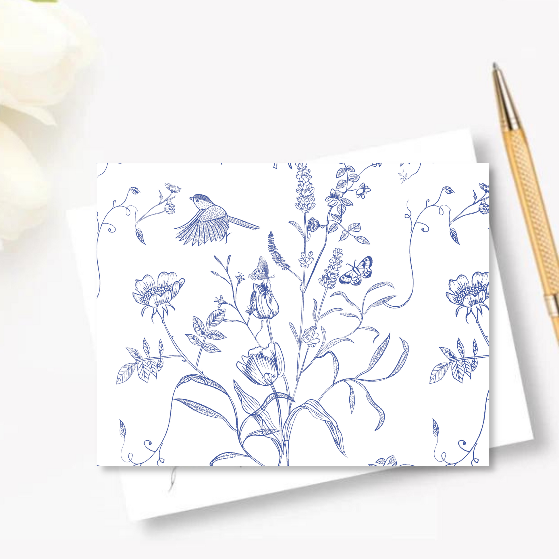 Elevate your stationery game with our Chinoiserie Line Art Note Cards. This set of cards boasts delicate blue bird and floral illustrations, perfect for any occasion. Impress your friends and family with these elegant note cards.