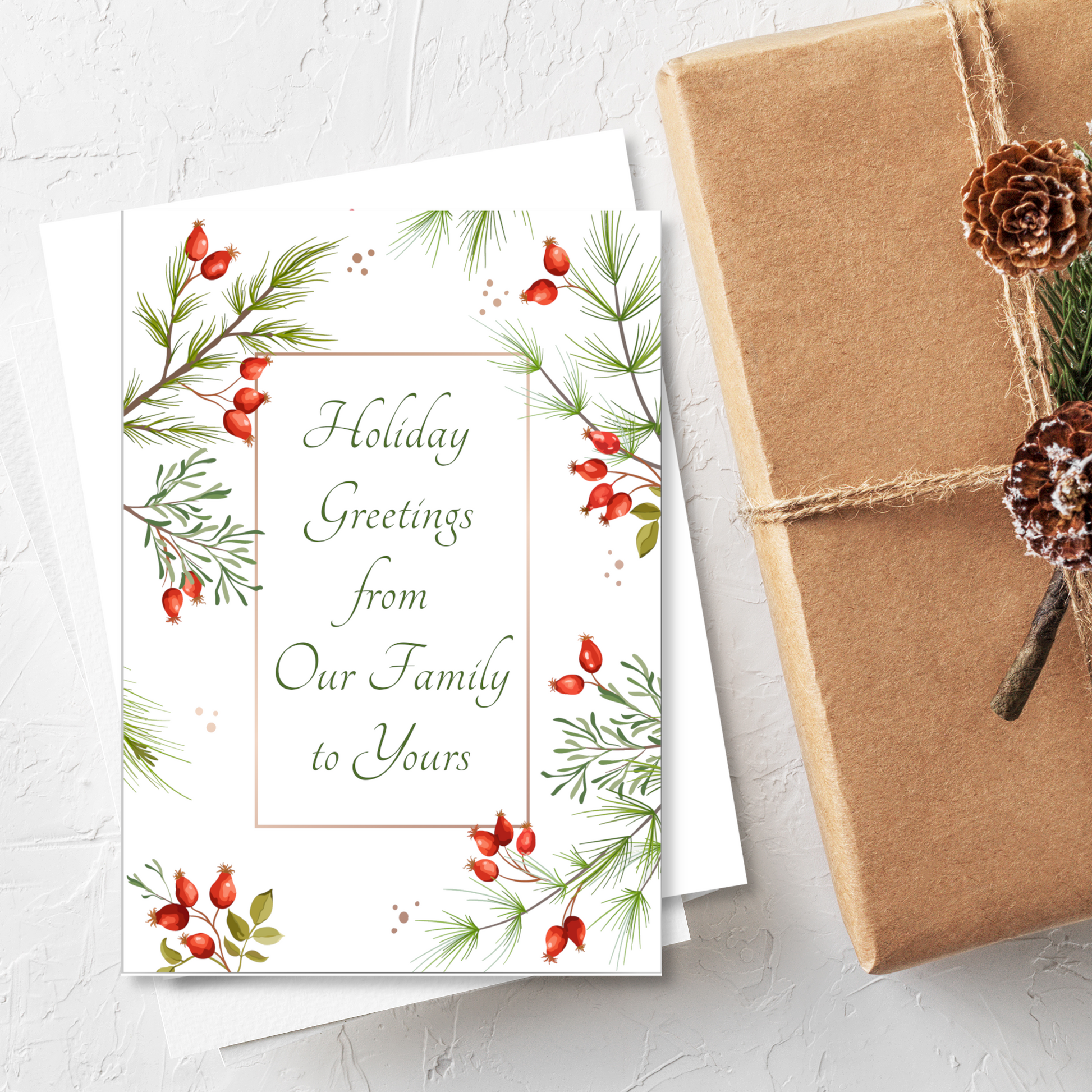 Add a touch of elegance to your holiday greetings with our watercolor Holly Frame Christmas Card. Delight your loved ones with this charming design that captures the spirit of the season. Spread joy and good cheer with every heartfelt message you write inside.