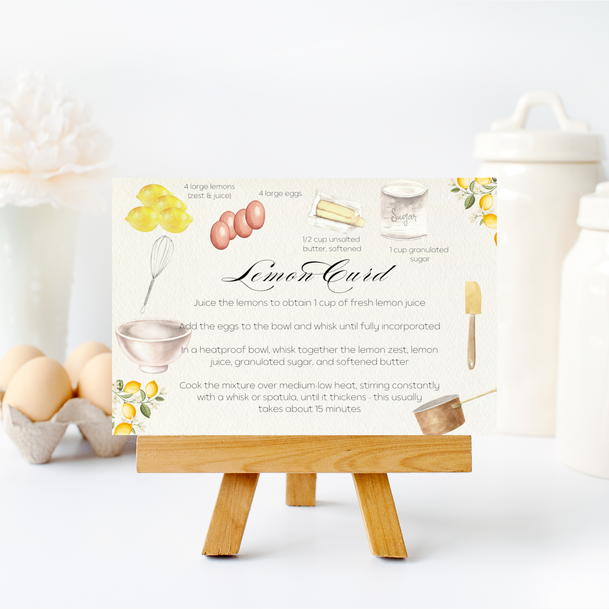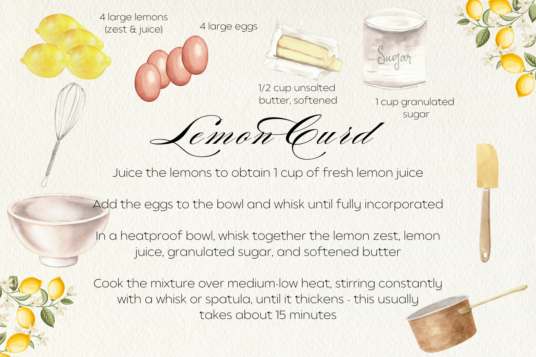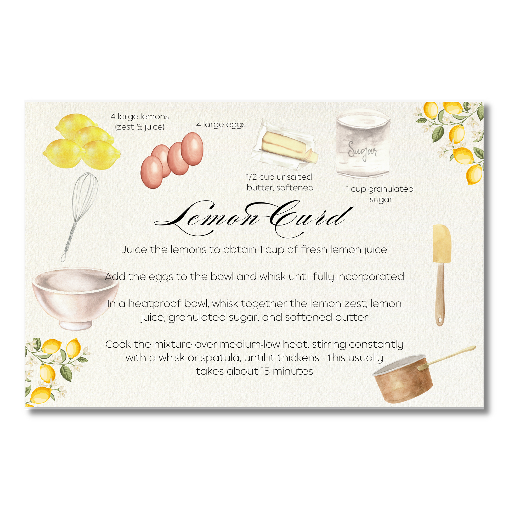 Learn how to make delicious lemon curd with our illustrated recipe card. Featuring beautiful watercolor graphics, this easy-to-follow guide will help you create a sweet and tangy treat. Impress your friends and family with your homemade lemon curd, perfect for desserts, breakfast, or as a gift.