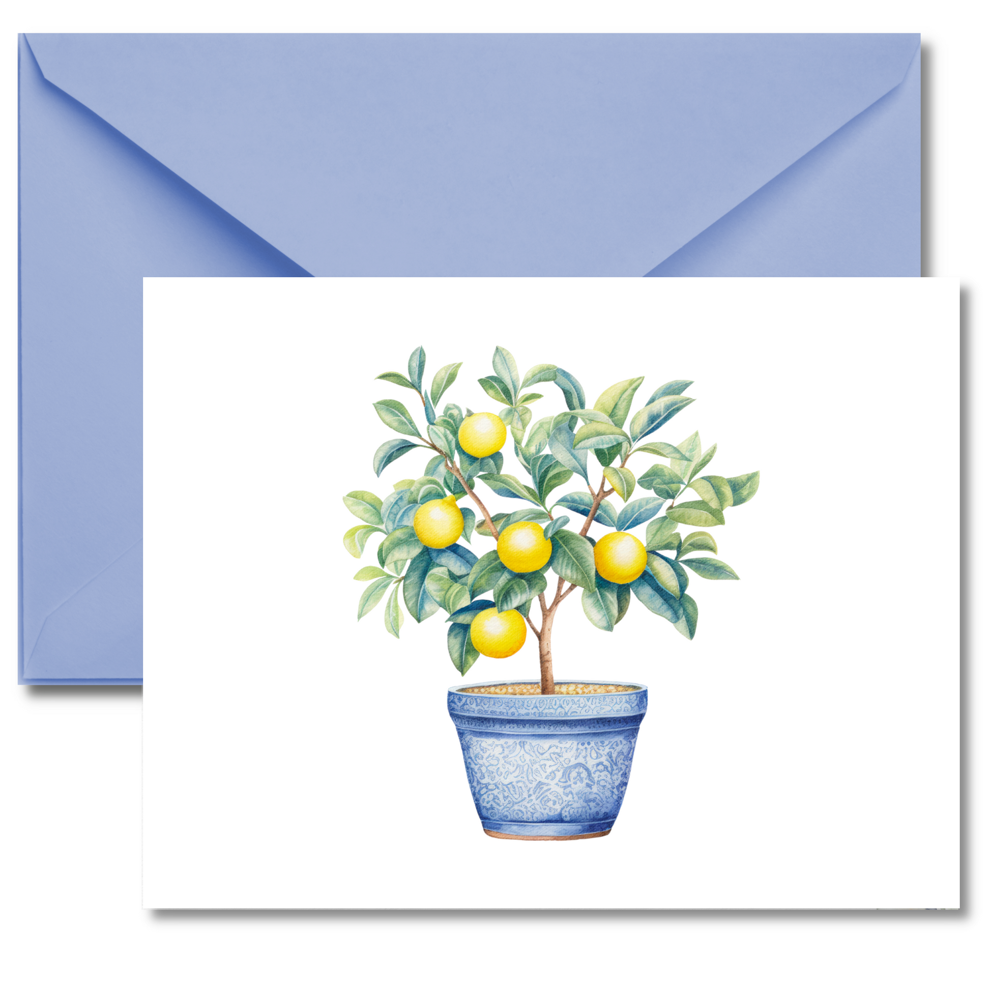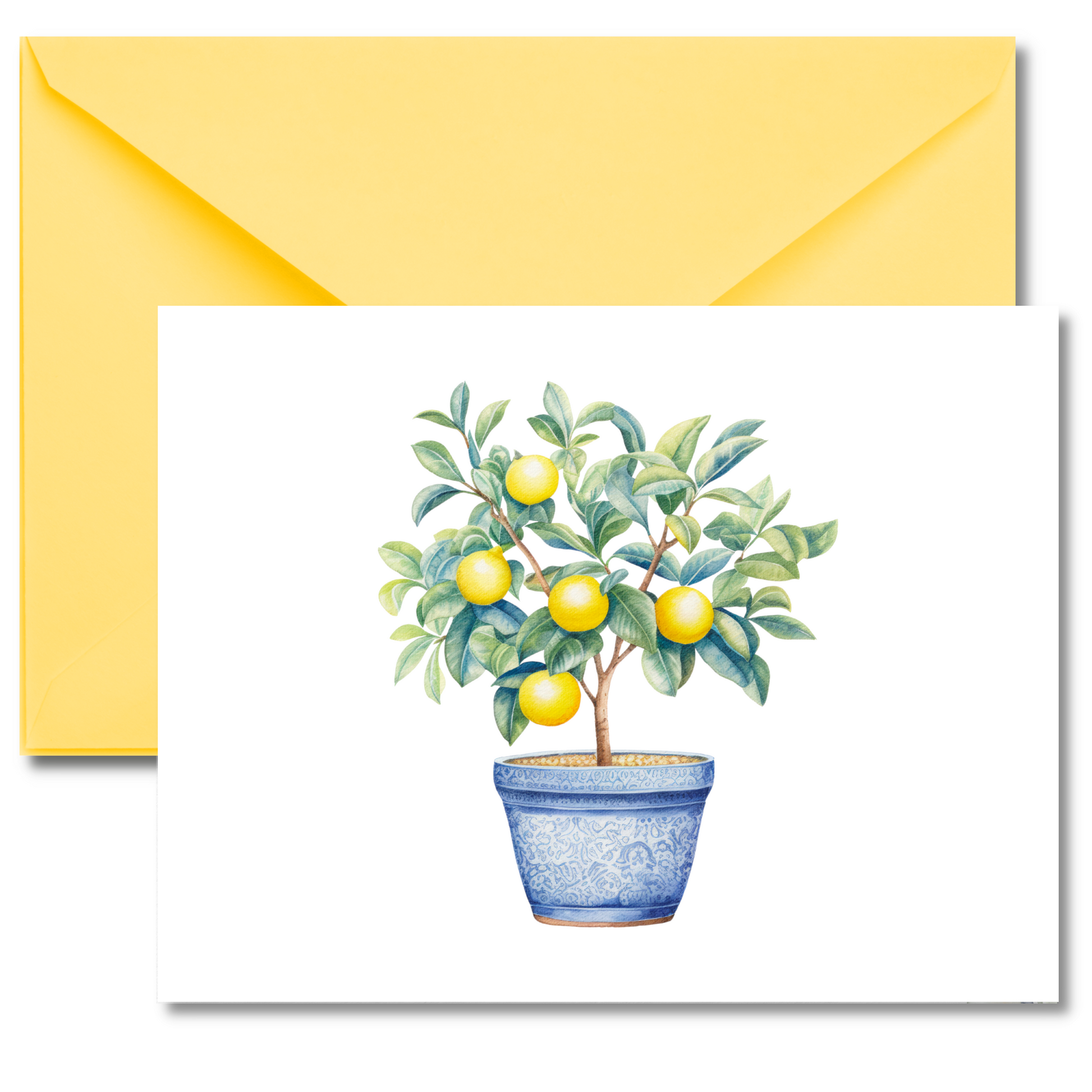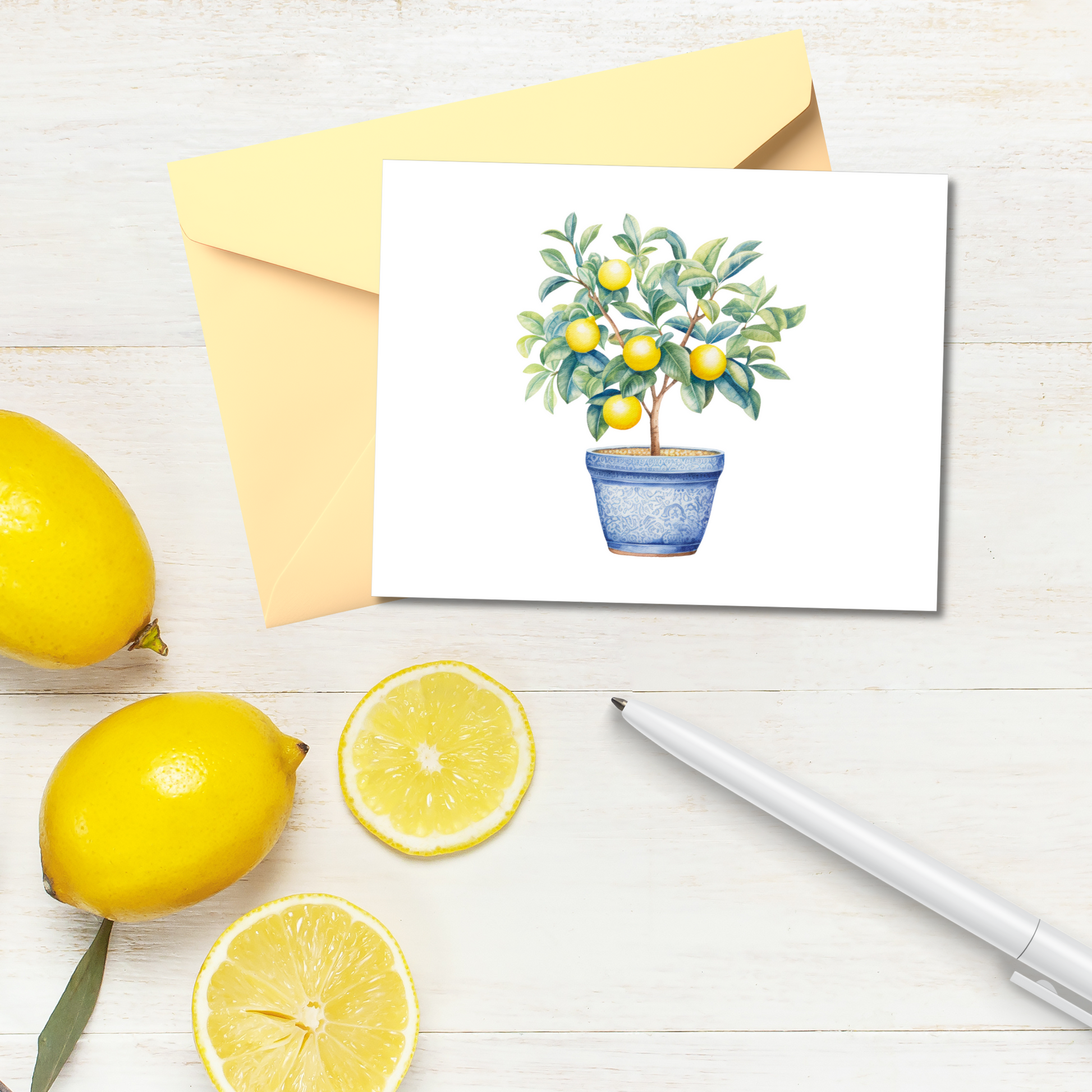 Surprise your loved ones with this set of potted Lemon Trees note cards. Designs feature fresh watercolor lemon trees. Perfect for any occasion, these cards come in sets of six, 2 of each design. Gift box optional. Let the refreshing colors and thoughtful notes brighten someone's day.