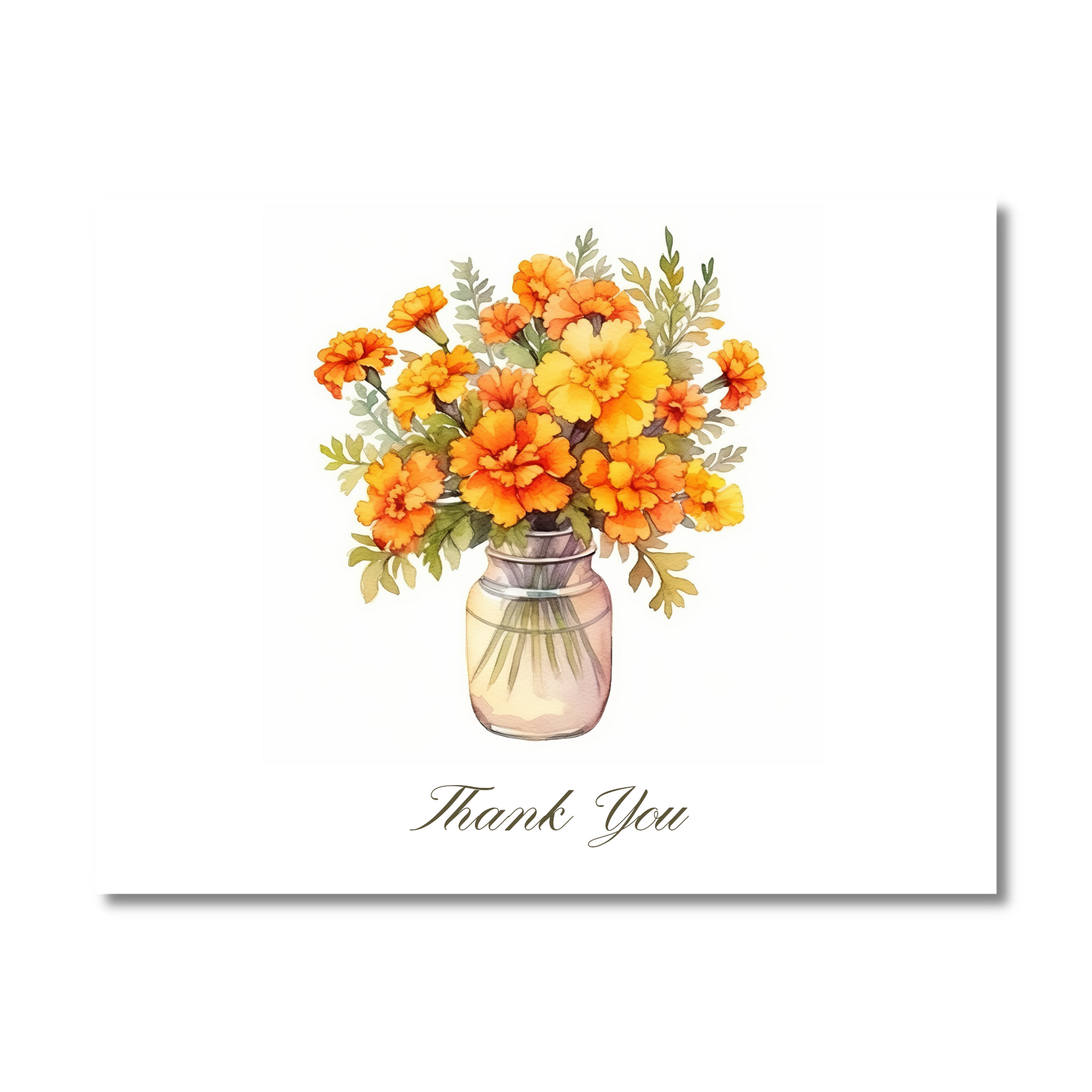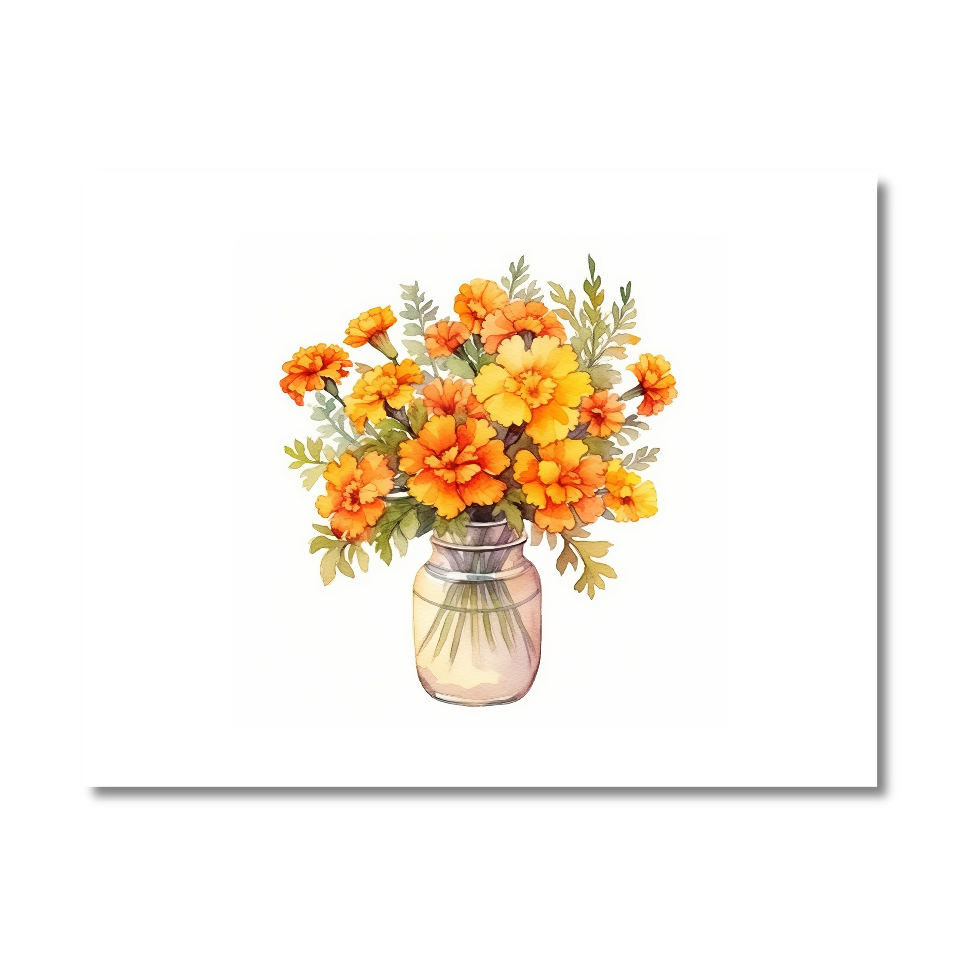 Express your warm wishes with our Marigolds in Jar Note Card Set. The vibrant orange watercolor marigolds in a rustic jar add a pop of color to any message. Perfect for thank you notes or as a personalized gift. Say it with flowers, say it with our note card set.