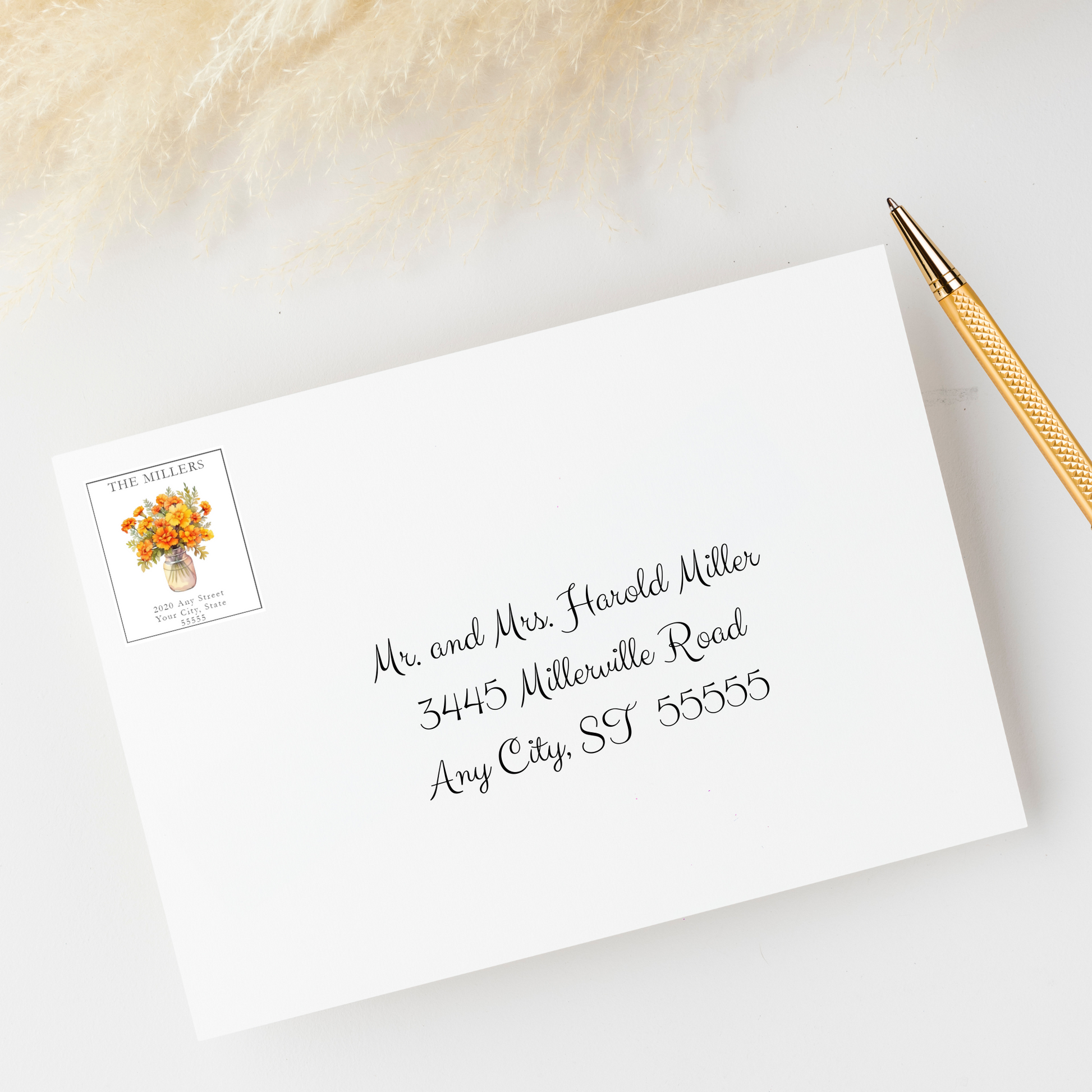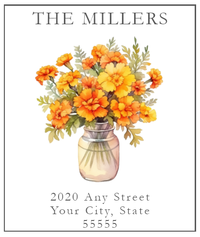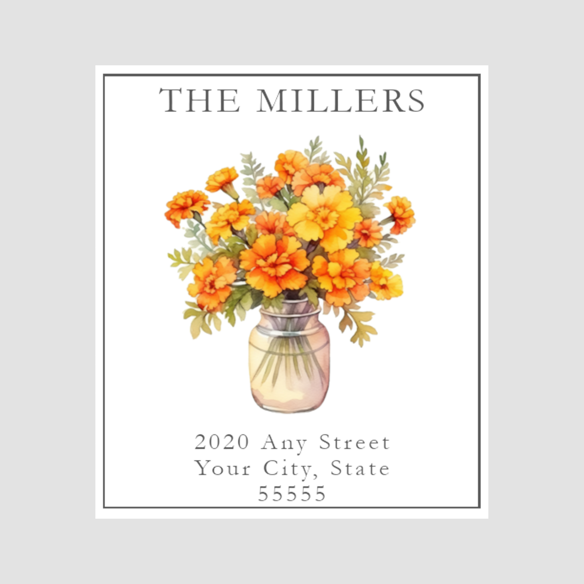 Effortlessly add a pop of color to your mail with our Marigolds in Vase Printed Return Address Labels. Featuring vibrant watercolor autumn marigolds in a charming vase, these labels bring a touch of nature to all your correspondence. Make addressing envelopes a breeze while adding a cheerful touch to your letters.