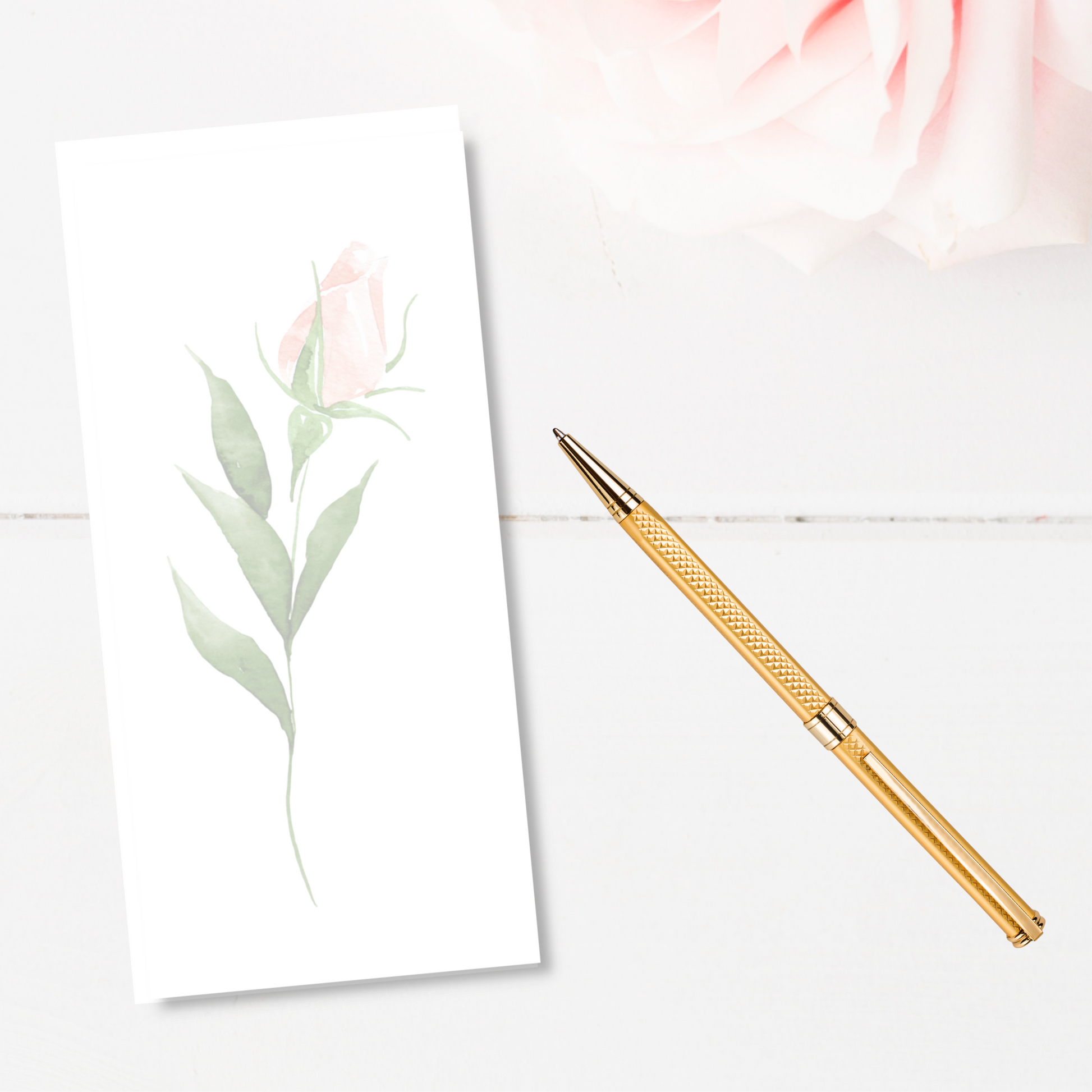 Organize your notes in style with the Opaque Rosebud Long Note Pad. Featuring a beautiful rosebud design, this note pad is perfect for jotting down ideas, reminders, and to-do lists. The long shape allows for more writing space. Keep your thoughts close and your days organized with this charming note pad.