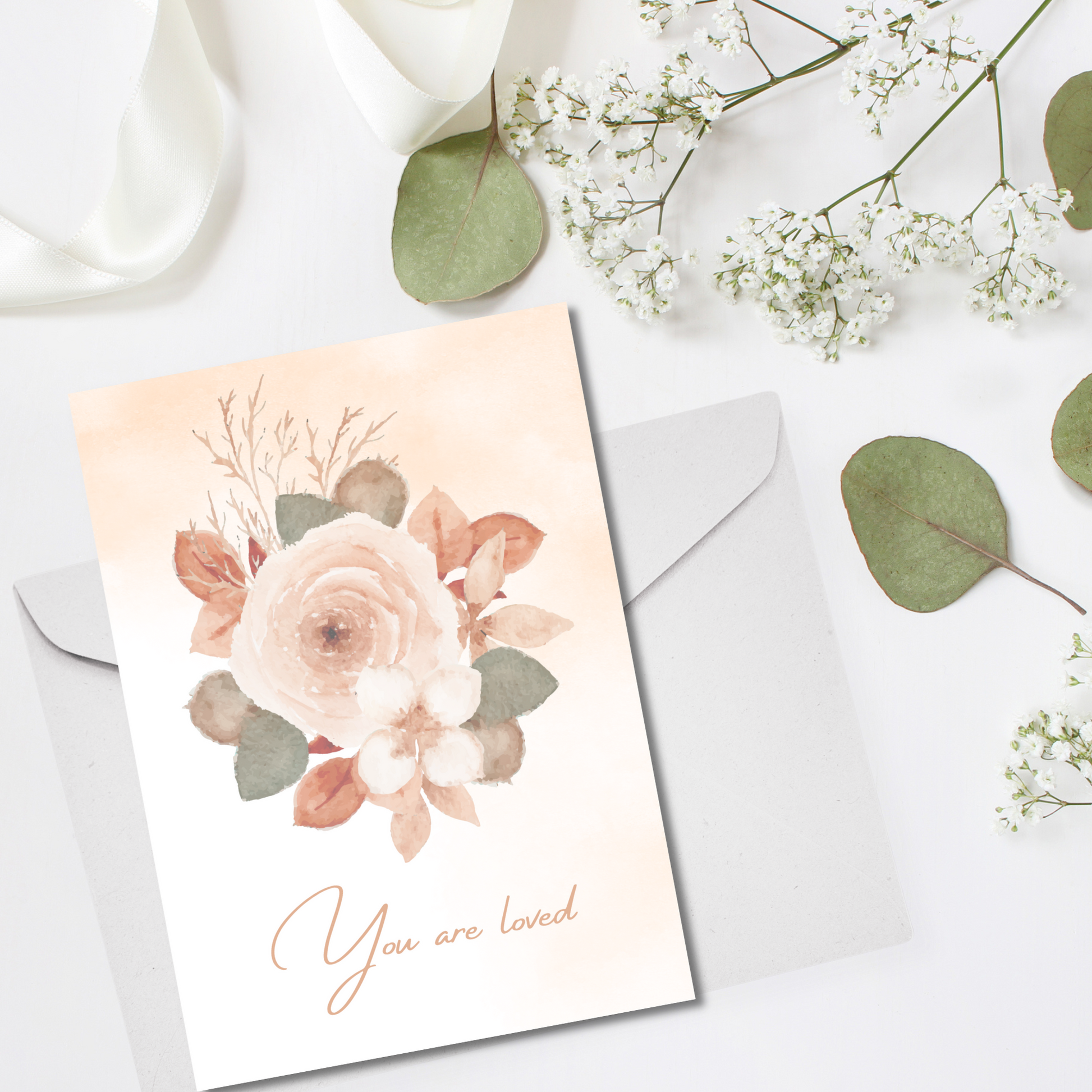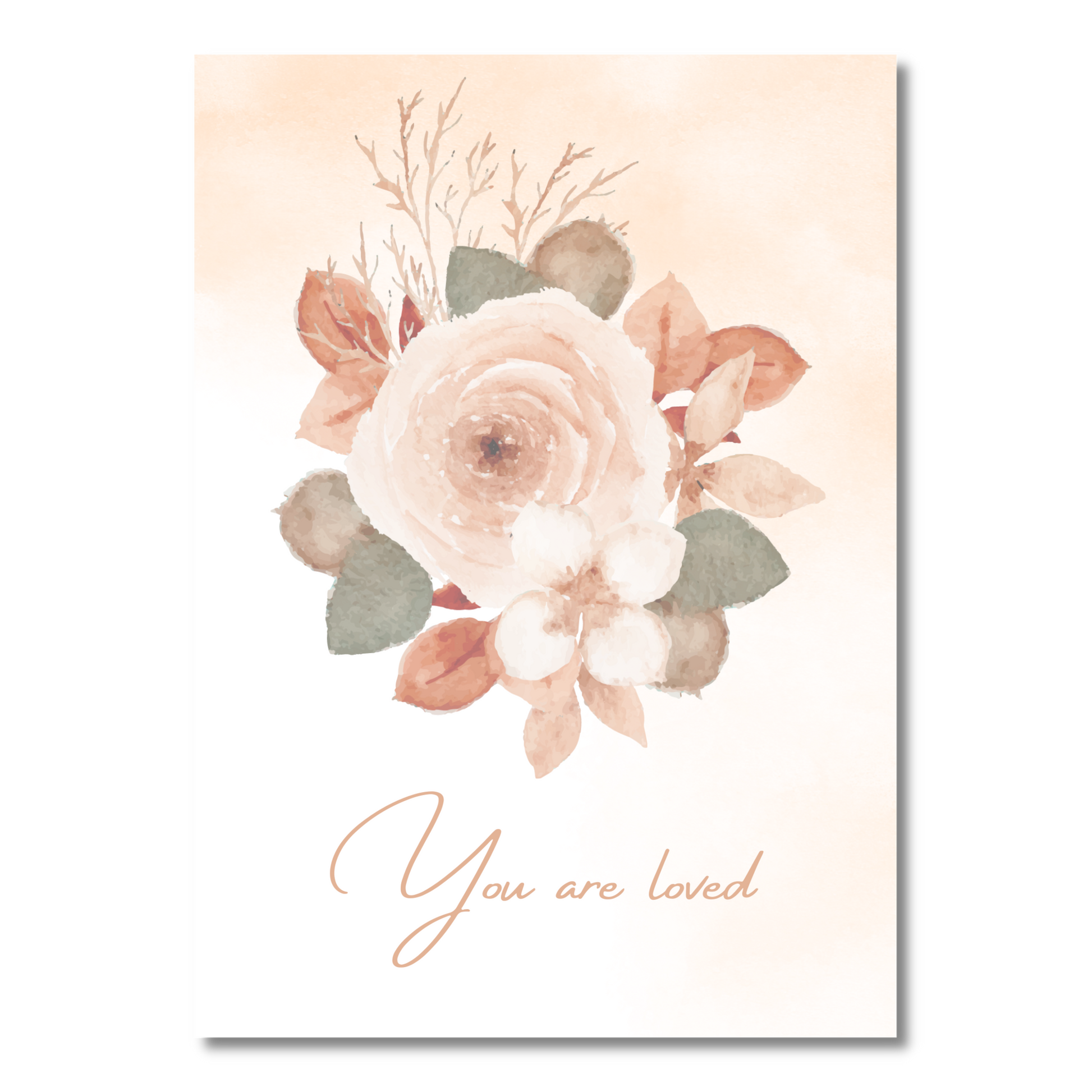 This Peach Watercolor Floral You are Loved Greeting Card is a beautiful way to show your loved ones how much they mean to you. The delicate peach watercolor floral design adds a touch of elegance, while the heartfelt message "You are Loved" conveys your warmest sentiments. Perfect for any occasion.