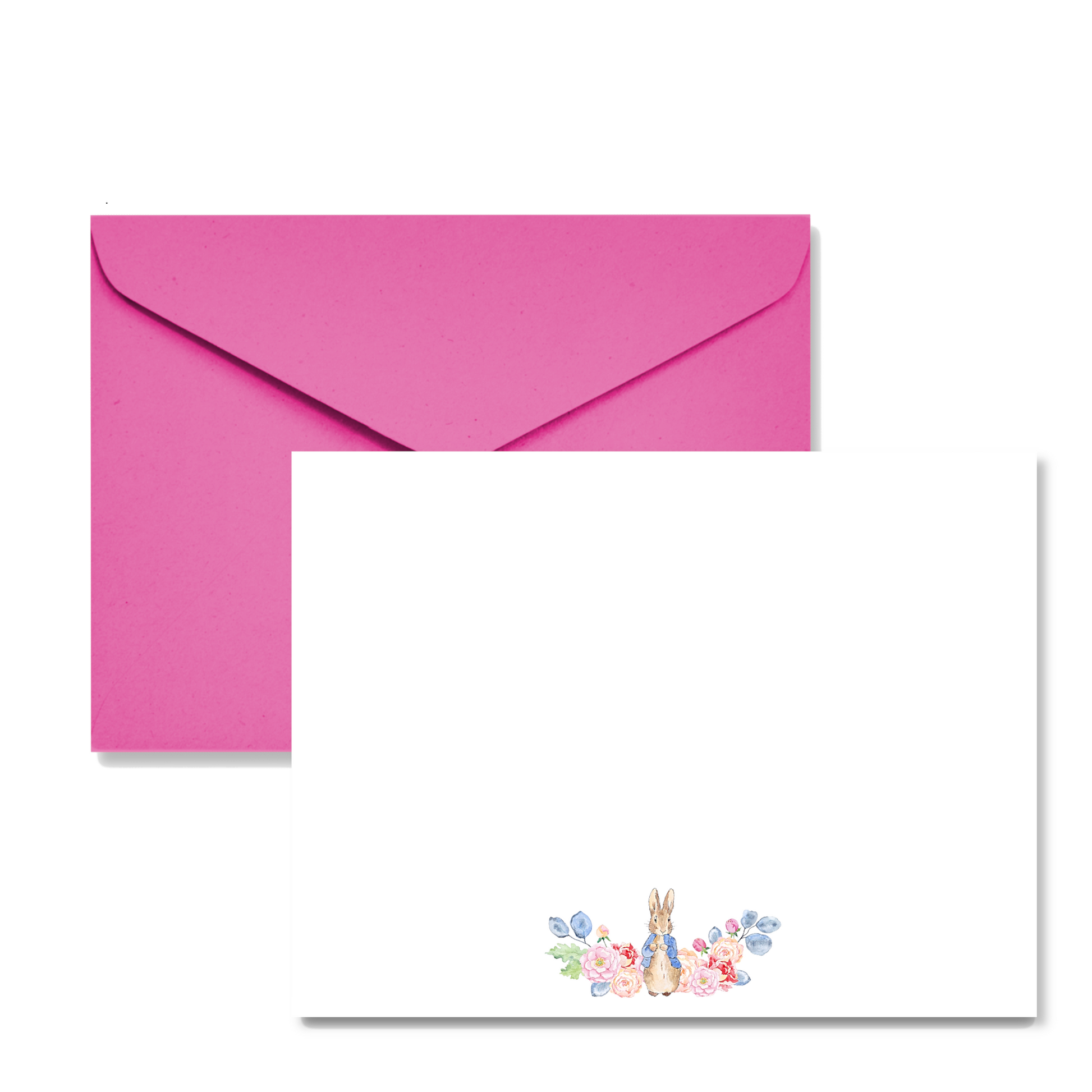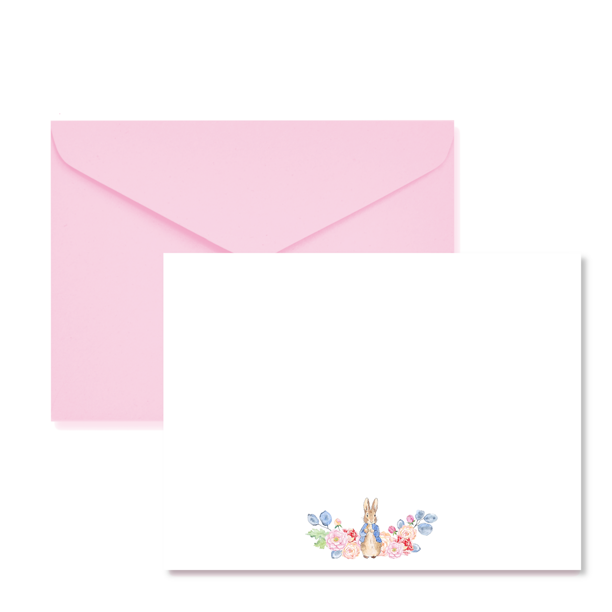 This Peter Rabbit Floral Flat Note is perfect for baby shower thank you notes. Designed with a charming floral pattern and featuring Peter Rabbit, these notes are stylish and sweet. Show your appreciation to loved ones in a thoughtful and adorable way.