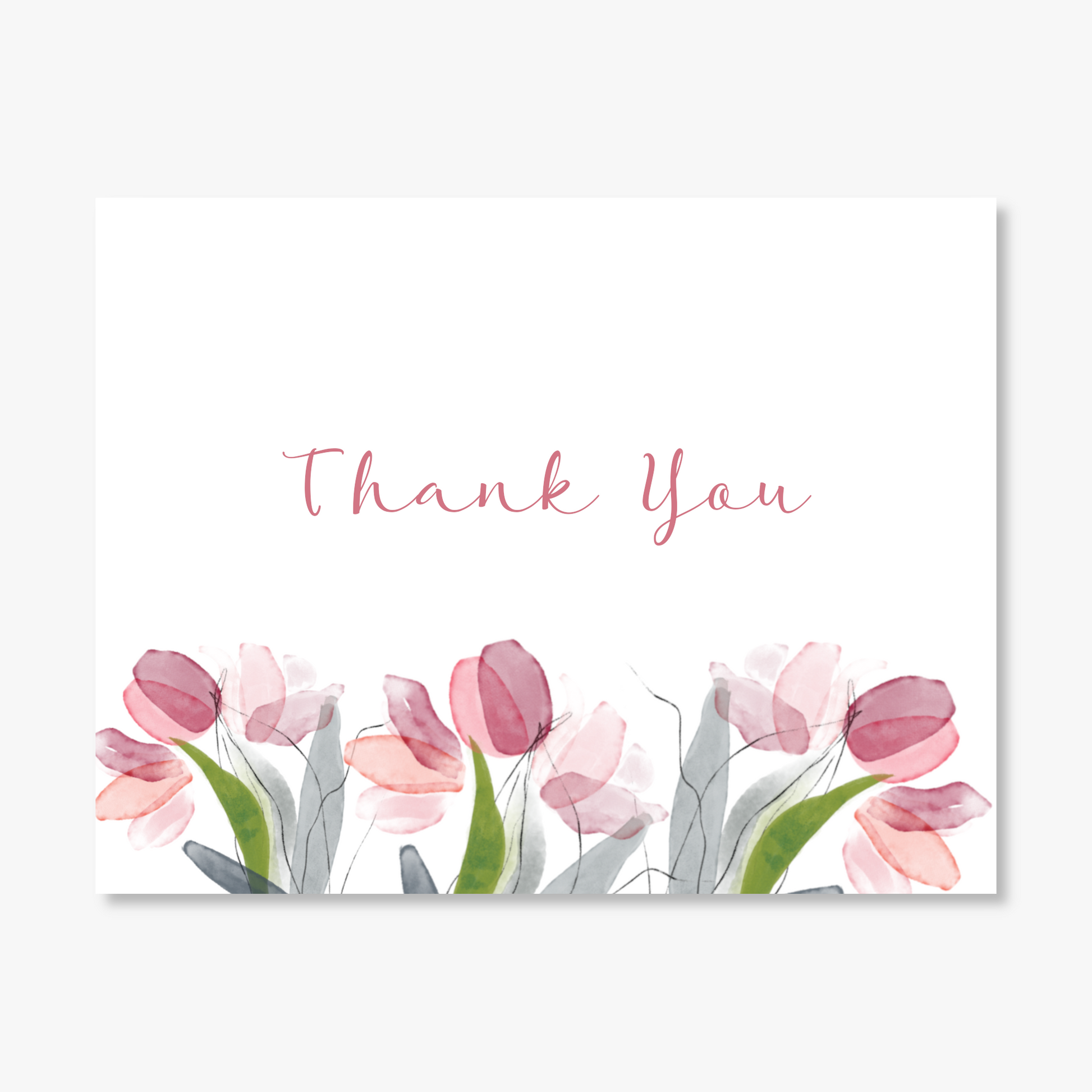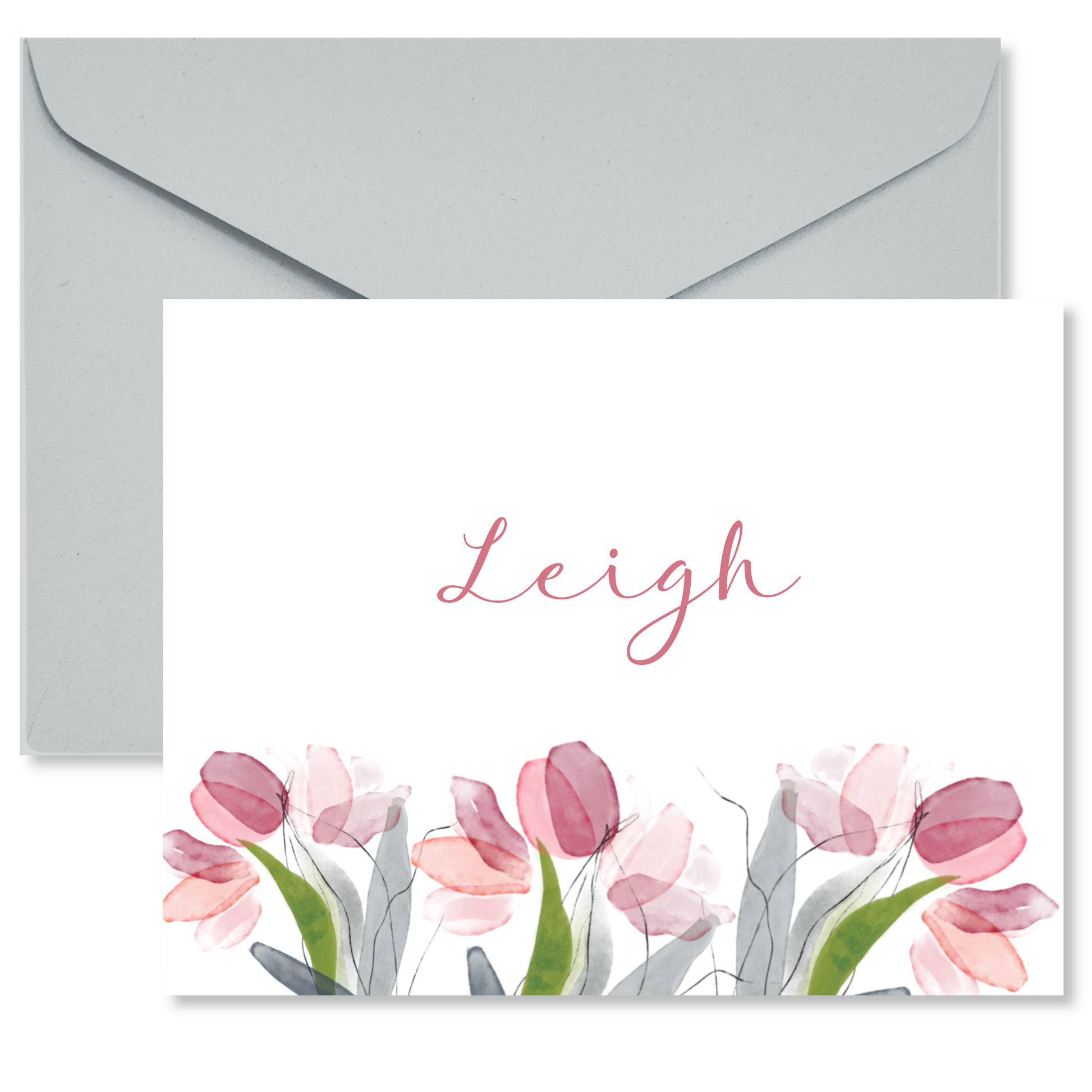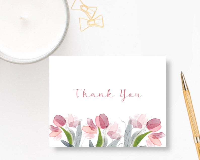 These personalized note cards feature a pink line art tulip design with a beautiful tulip spray at the bottom. Perfect for sending thank you notes, the watercolor effect adds a touch of elegance to your correspondence. Make a statement with these unique and stylish note cards.